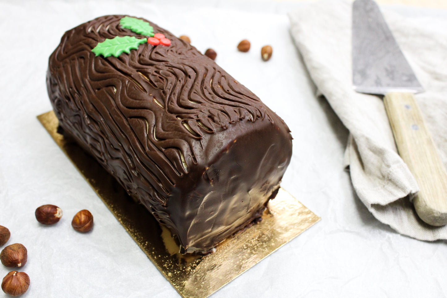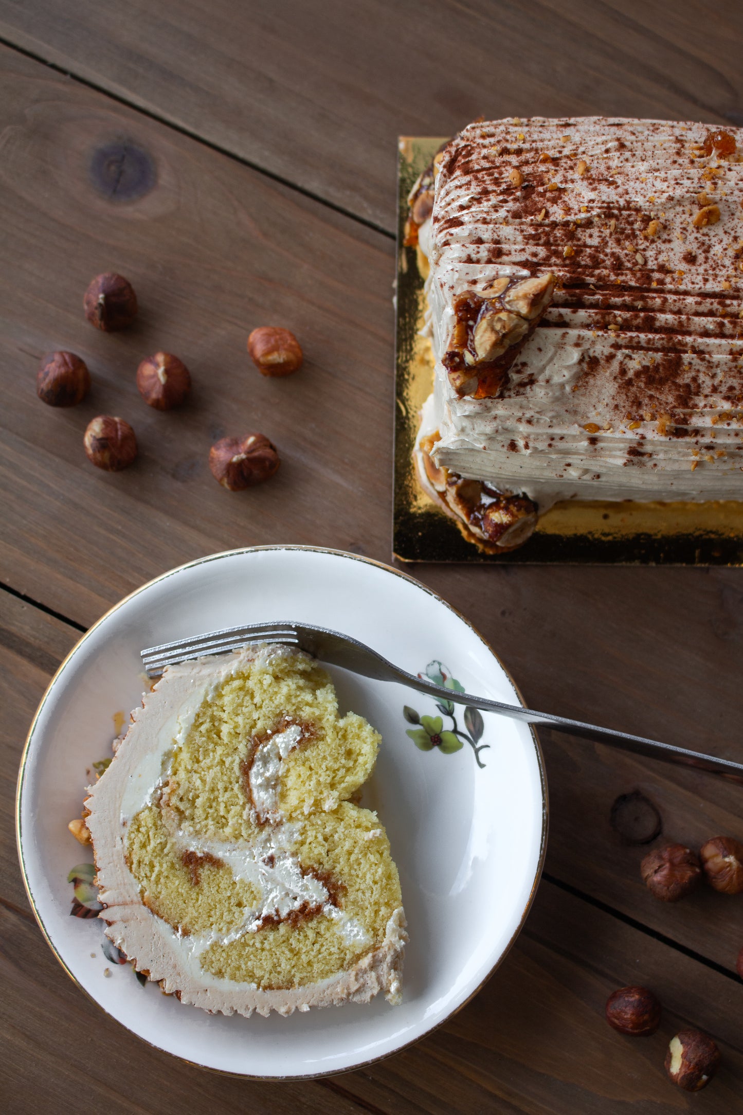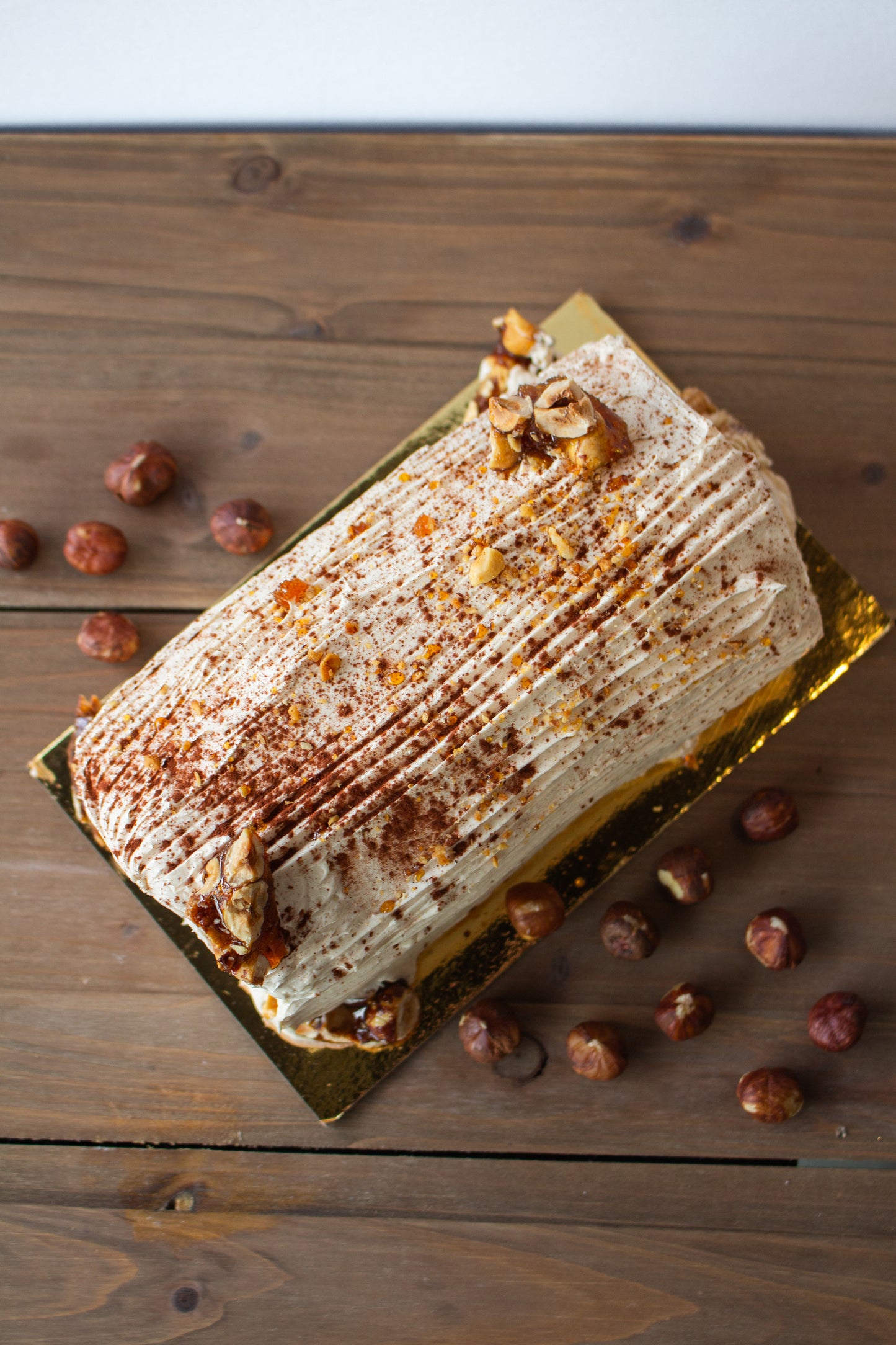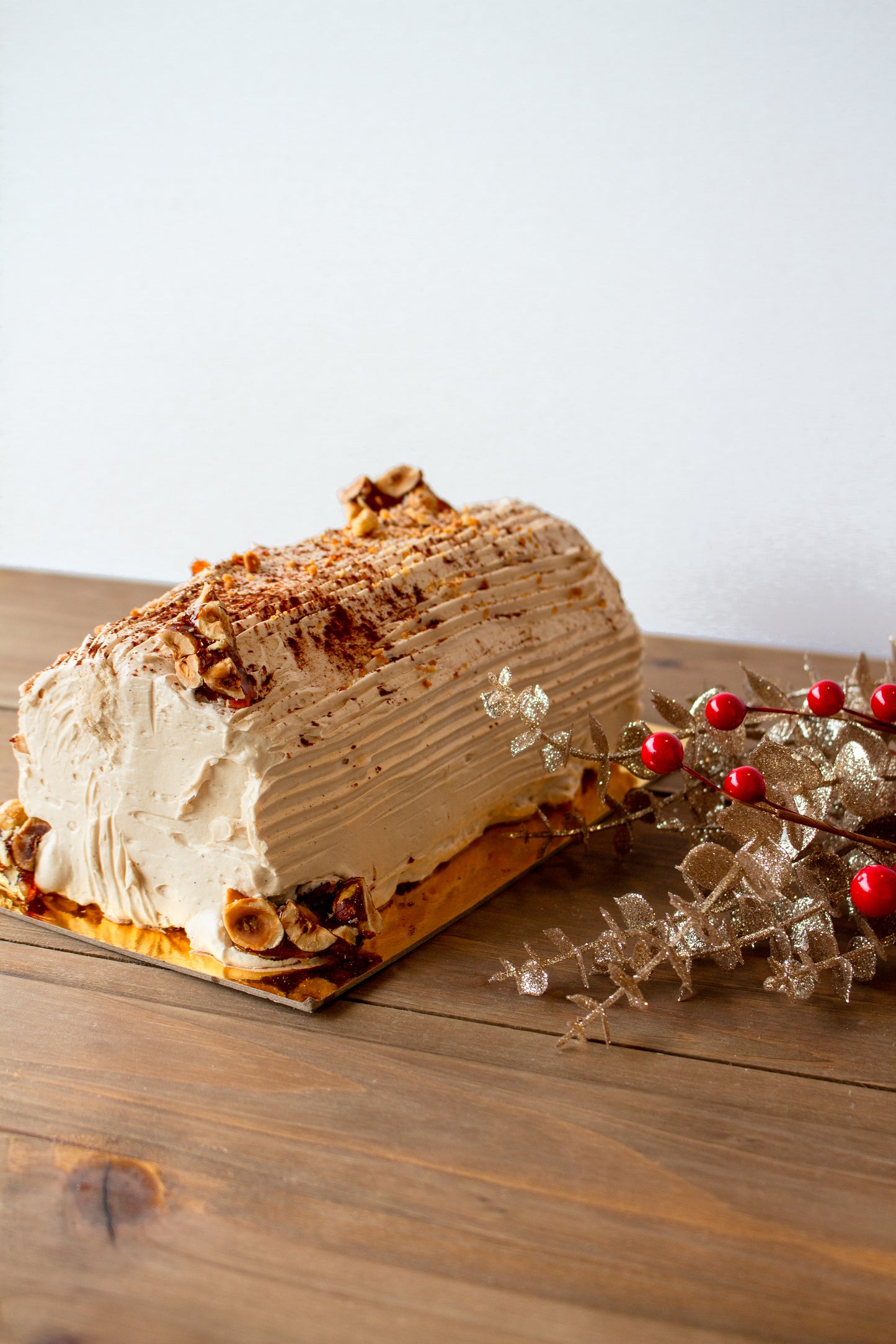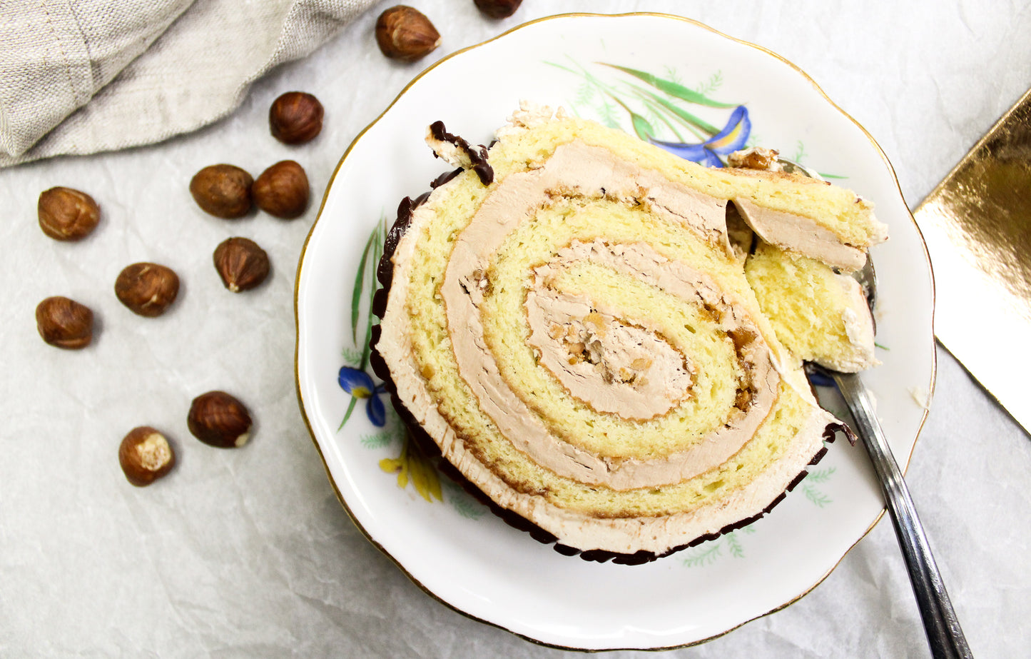 Sponge cake rolled with vanilla buttercream and hazelnut brittle inside, masked with vanilla buttercream and chocolate ganache.