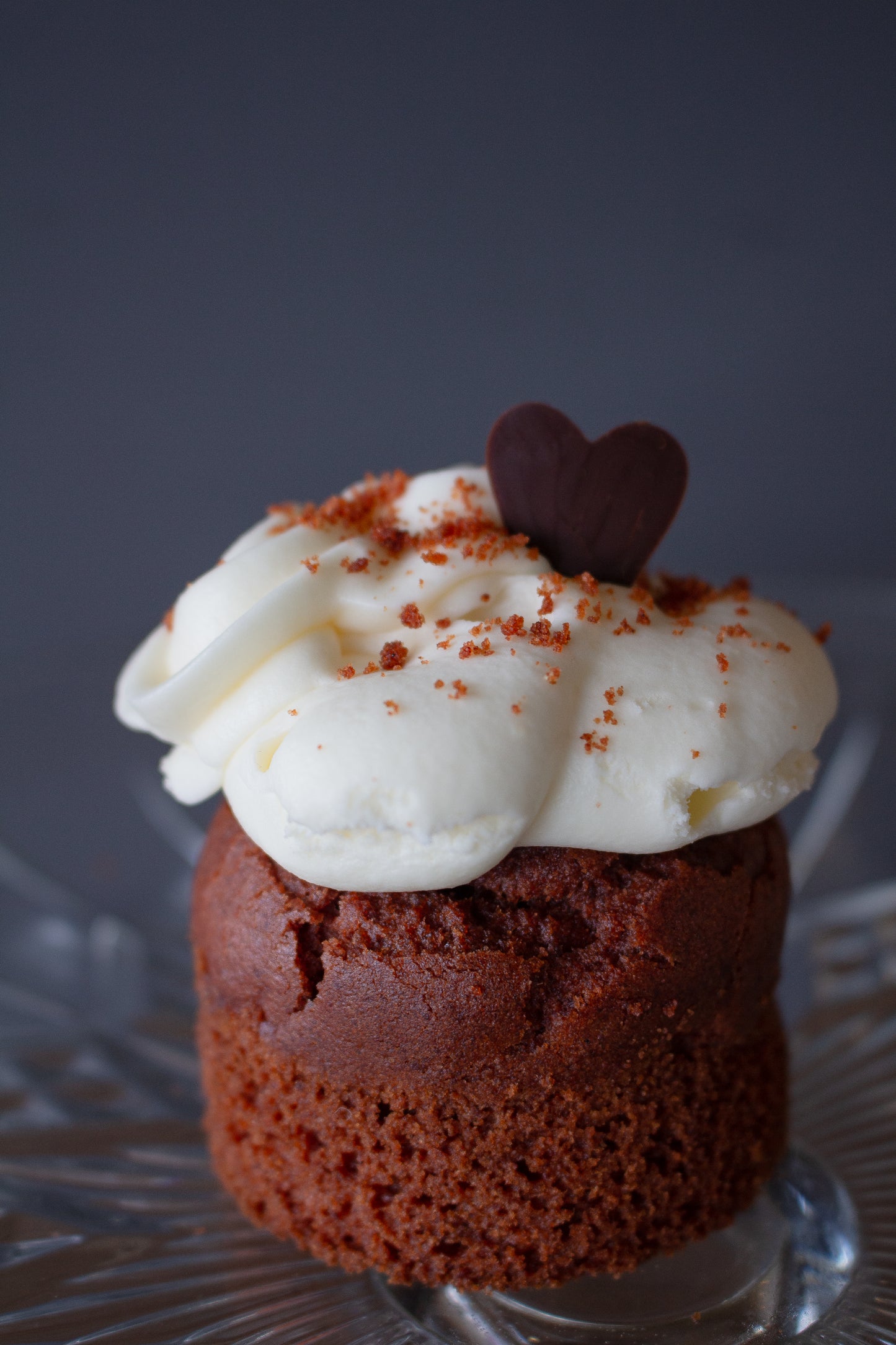 Perfect for Valentines Day, this beautiful red velvet cupcake is covered with cream cheese frosting and decorated with house made chocolate hearts. The perfect February treat.